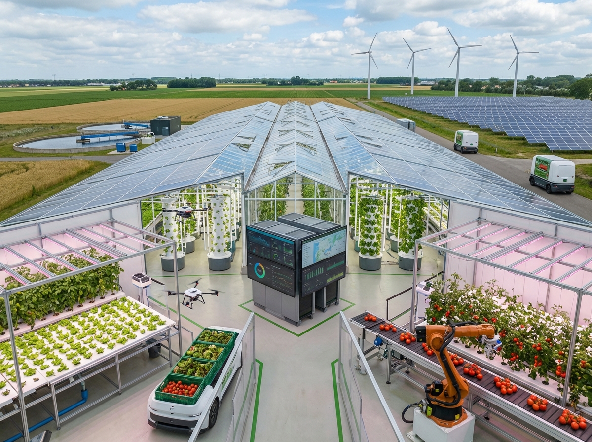 Современный тепличный комплекс выращивает экологически чистые овощи круглый год, используя инновационные технологии, автоматизацию процессов и контроль микроклимата для высокого урожая.